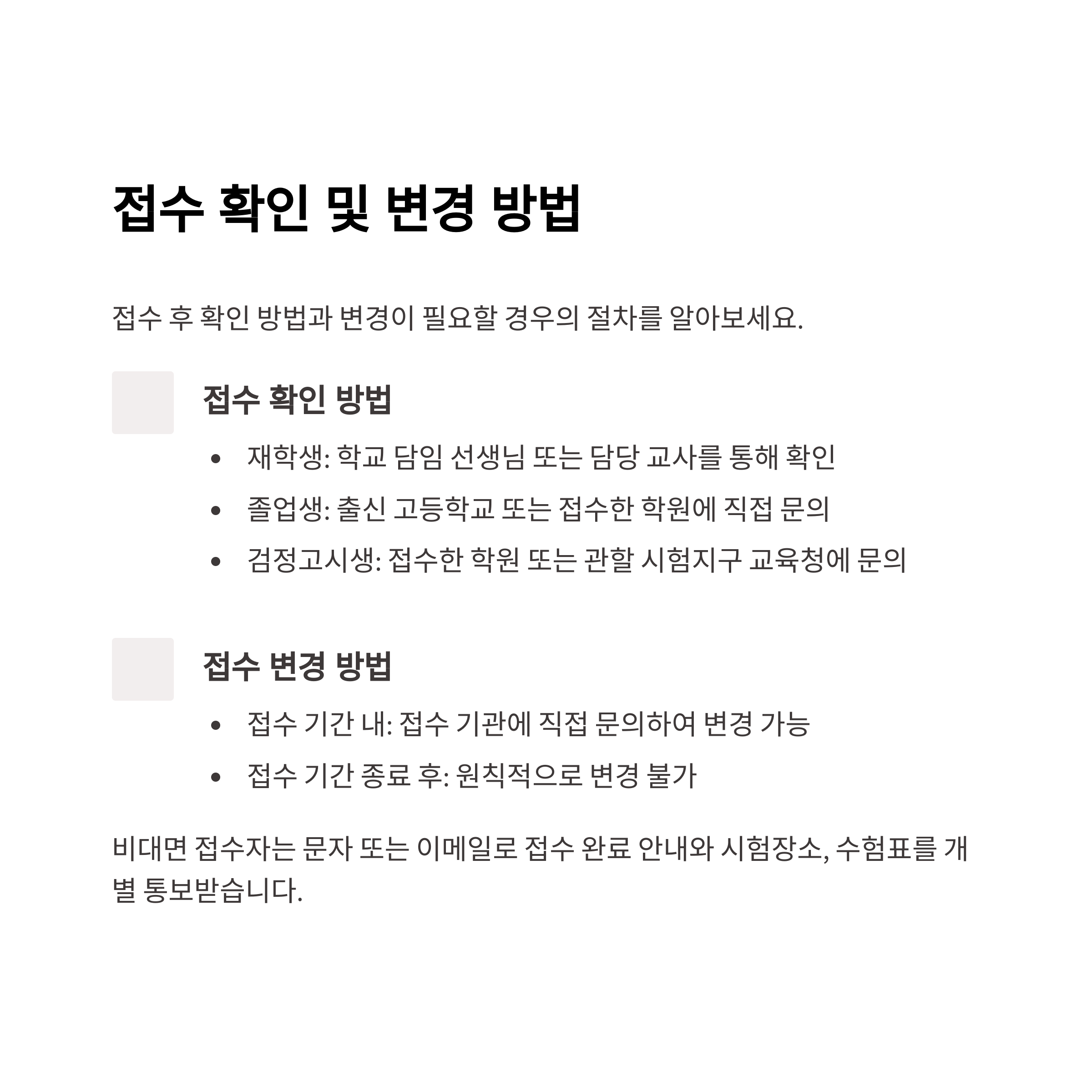 • 접수 확인 및 변경: 접수기관에 직접 문의, 접수 기간 내에만 변경 가능