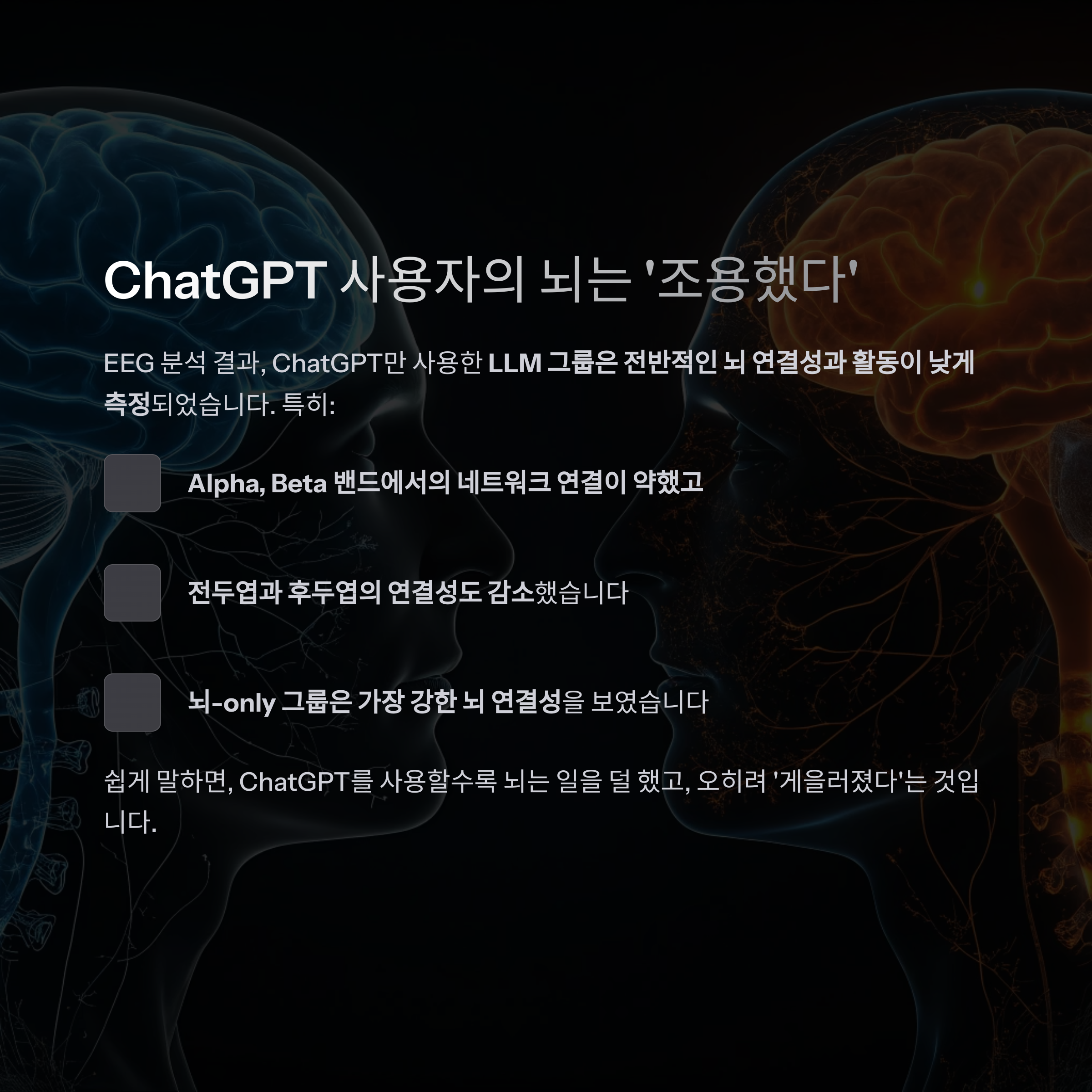 쉽게 말하면, ChatGPT를 사용할수록 뇌는 일을 덜 했고, 오히려 '게을러졌다'는 것이죠.