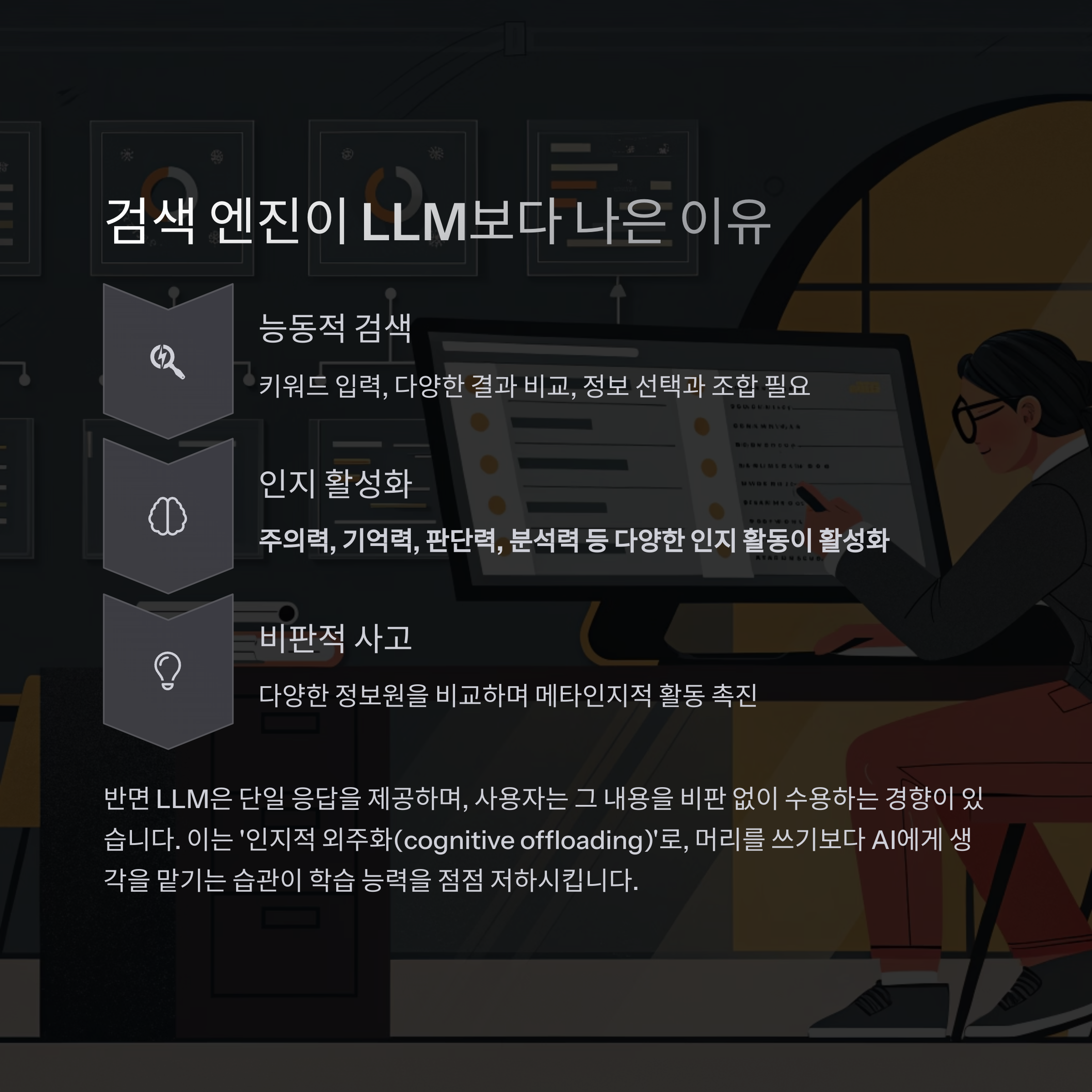 이는 비판적 사고의 약화, 메타인지적 활동의 축소, 학습 태도의 수동화를 불러오게 되죠.