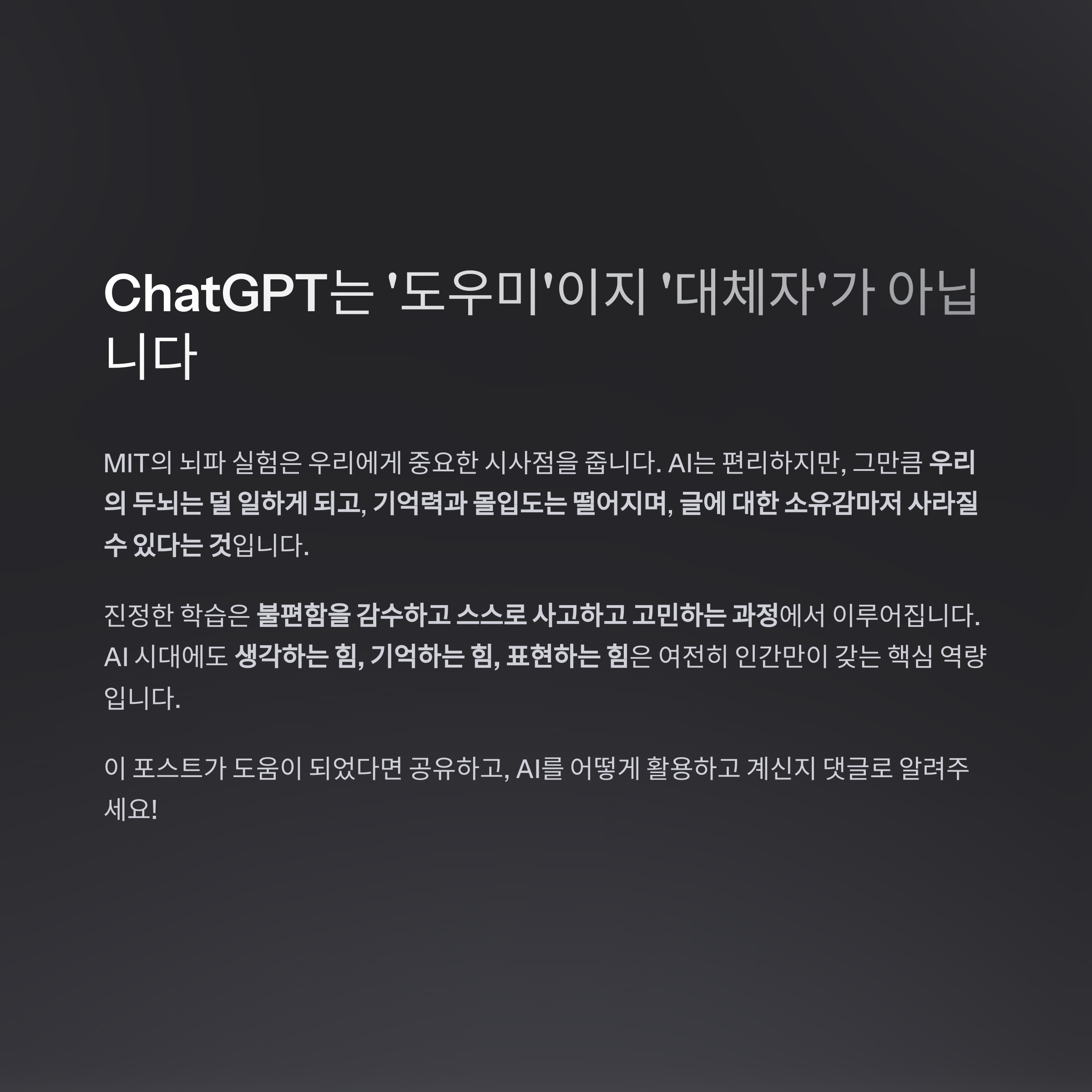 AI는 편리하지만, 그만큼 우리의 두뇌는 덜 일하게 되고, 기억력과 몰입도는 떨어지며, 글에 대한 소유감마저 사라질 수 있다는 것입니다.