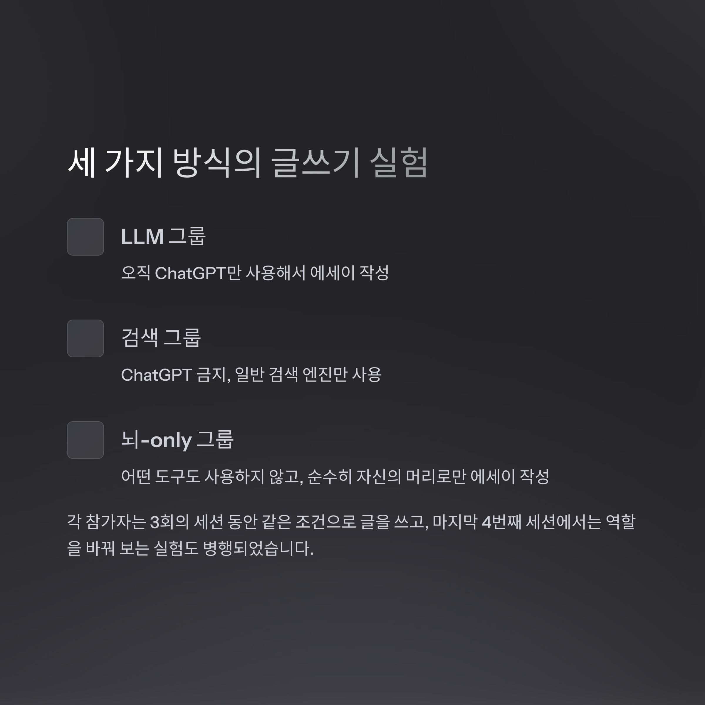 - 뇌-only 그룹: 어떤 도구도 사용하지 않고, 순수히 자신의 머리로만 에세이 작성