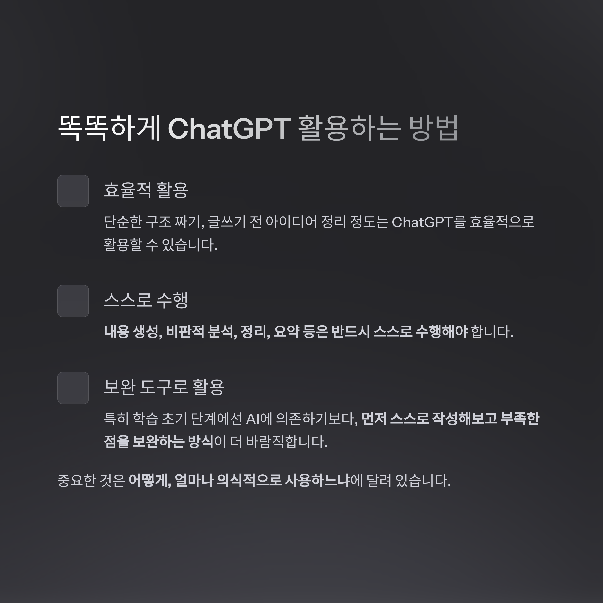 - 특히 학습 초기 단계에선 AI에 의존하기보다, 먼저 스스로 작성해보고 부족한 점을 보완하는 방식이 더 바람직합니다.