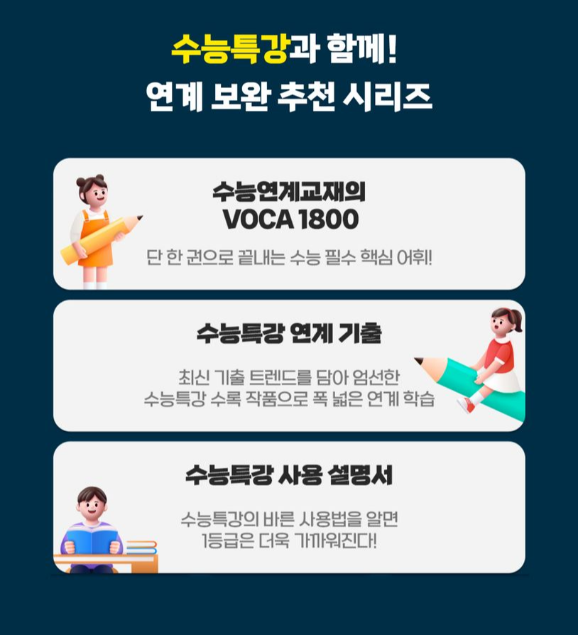 "수능특강 영어독해연습" 교재는 2024년 대학수학능력시험을 대비하여 제작되었으며, 최신 교육과정을 반영하여 구성되었습니다. 특히 학생들의 읽기 능력 신장을 목적으로 하여 다양하고 참신한 주제와 소재를 활용하여 어휘와 문장 구조를 이해하고 분석할 수 있는 능력을 향상시킬 수 있도록 고안되었습니다. 이번 포스팅에서는 2025학년도 수능 연계교재인 수능특강 영어독해연습 교재의 특장점 소개와 답지 관련 안내 드리겠습니다.