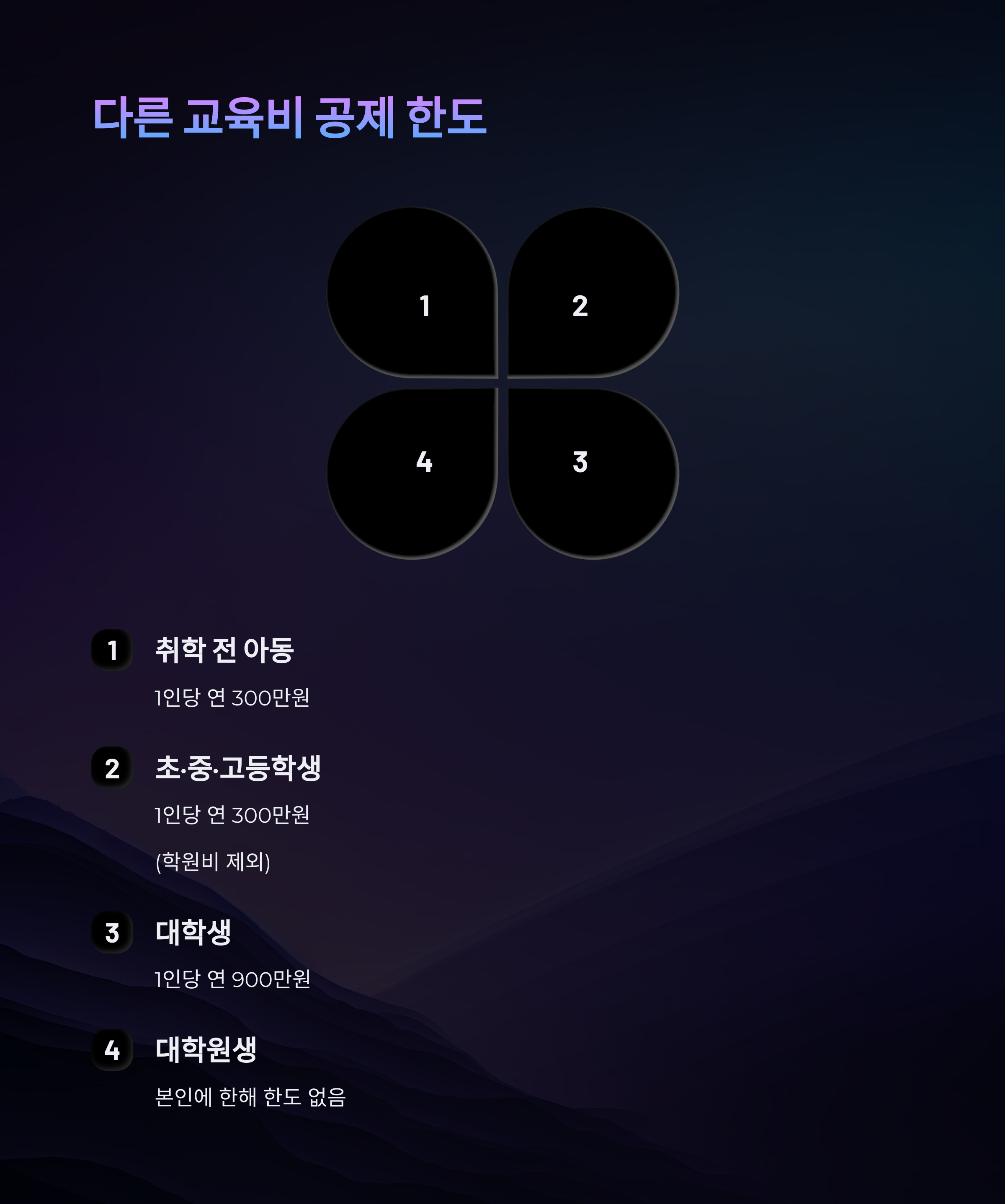 | 대학원생(본인) | 가능 | 제한 없음 | 본인에 한해 대학원 교육비도 공제 가능 |
